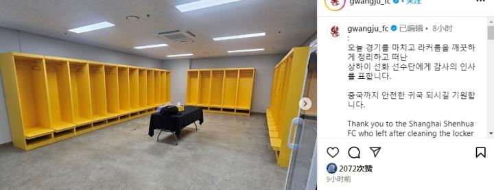 昨晚亚冠比赛结束后,上海申花队在离开光州客场前把更衣室收拾得整洁干净。对此,光州俱乐部官方社交媒体账号向上海申花致谢。