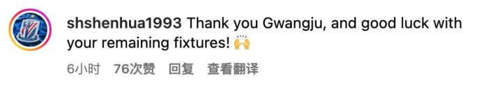 一上海申花俱乐部海外支持者账号在评论区留言回复:“谢谢光州俱乐部,也希望你们在接下来的征程中好运🙌”