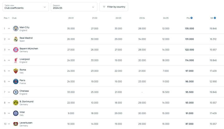北京时间12月24日,欧足联公布了各俱乐部和协会的年终系数排名,其中,曼城连续三年位列第一,英格兰则位居协会排名第一。