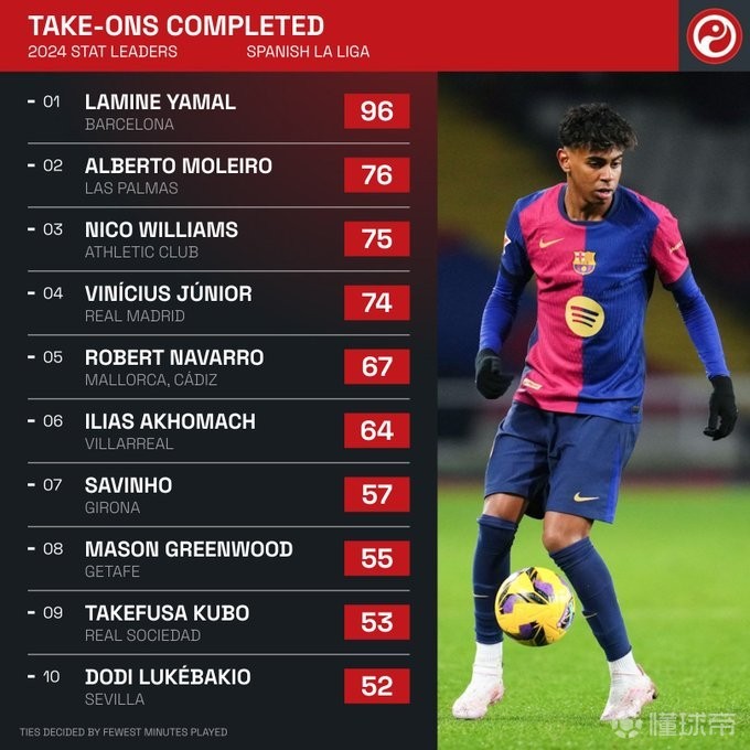 根据统计,2024年,亚马尔在各项赛事中完成了96次过人,比任何其他西甲球员都多。
