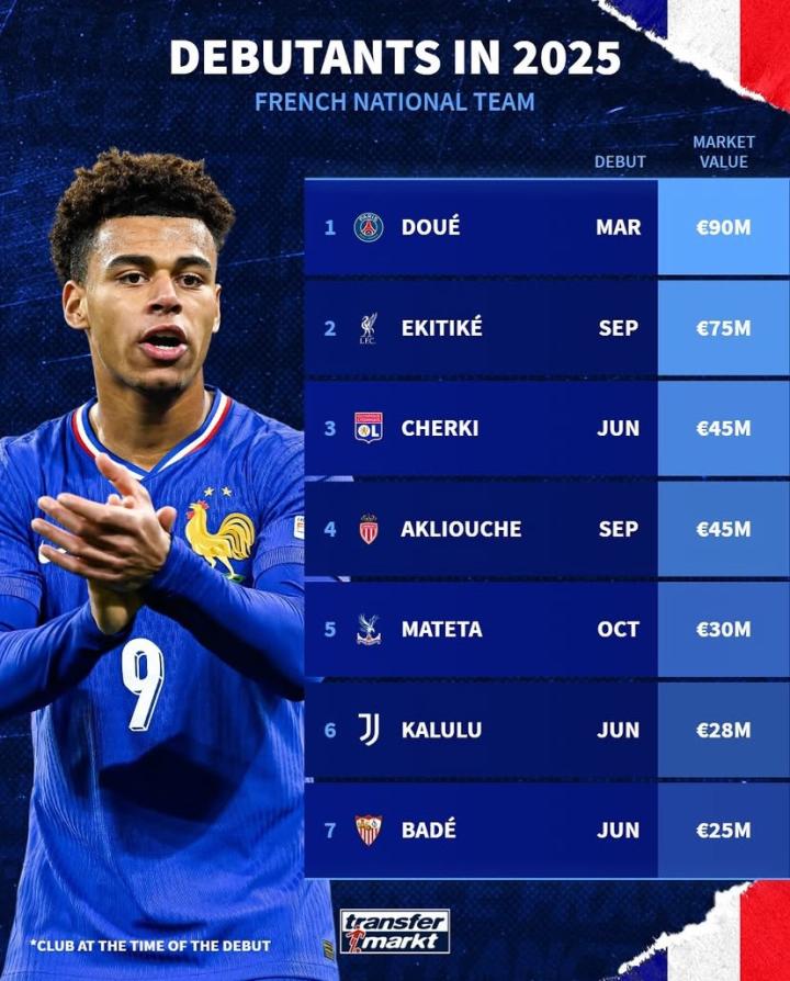 北京时间10月16日,德转列出了2025年完成法国国家队首秀的球员,其中包括了巴黎圣日耳曼的杜埃、利物浦的埃基蒂克、今夏转会曼城的谢尔基以及水晶宫的马特塔。