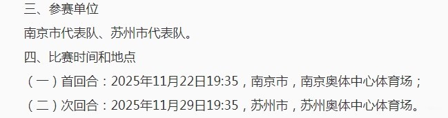 该报道表示,第二届江苏省足球发展重点城市对抗赛将于11月22日和11月29日举行。据官方报名系统显示,南京队主教练由中甲南京城市队主教练张晓峰担任,队员是以南京城市为主构成。苏州队则由前国脚李玮锋带队,队员以中甲苏州东吴球员为班底构成。