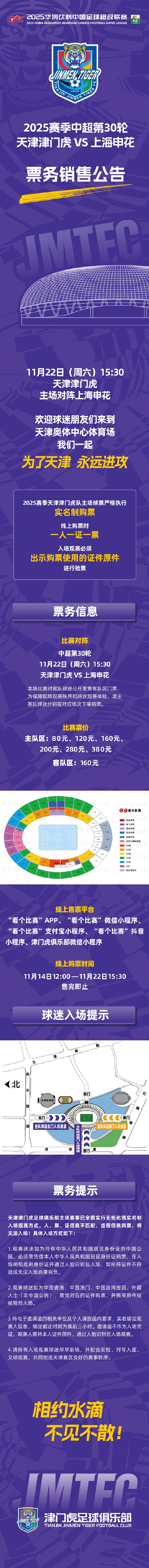 天津津门虎足球俱乐部发布票务销售公告:2025中超联赛第30轮天津津门虎vs上海申花的比赛球票将于11月14日12:00开售,更换主场后年票球迷将根据不同票档匹配座位。