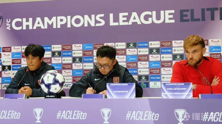 11月24日,成都蓉城对广岛三箭的赛前新闻发布会,主教练徐正源和球员提莫出席。