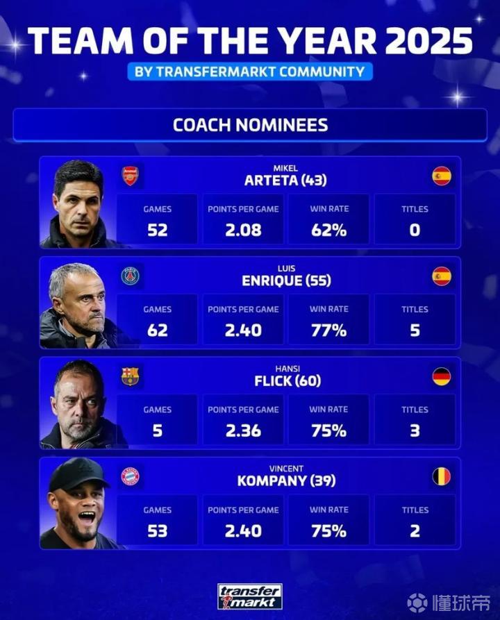 北京时间12月6日,德转列出了年度最佳主帅的四位候选者,阿森纳的阿尔特塔、巴黎圣日耳曼的恩里克、巴塞罗那的弗里克以及拜仁慕尼黑的孔帕尼入围。