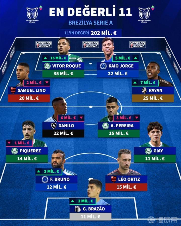北京时间12月11日,在更新了巴甲球员的身价之后,德转还列出了目前巴甲最贵的11人阵容,身价3500万欧元的维托尔-罗克领衔,阵容还包括了尤文图斯旧将凯奥-若热、马德里竞技旧将利诺、曼联旧将安德烈亚斯-佩雷拉以及国际米兰旧将布拉藏。