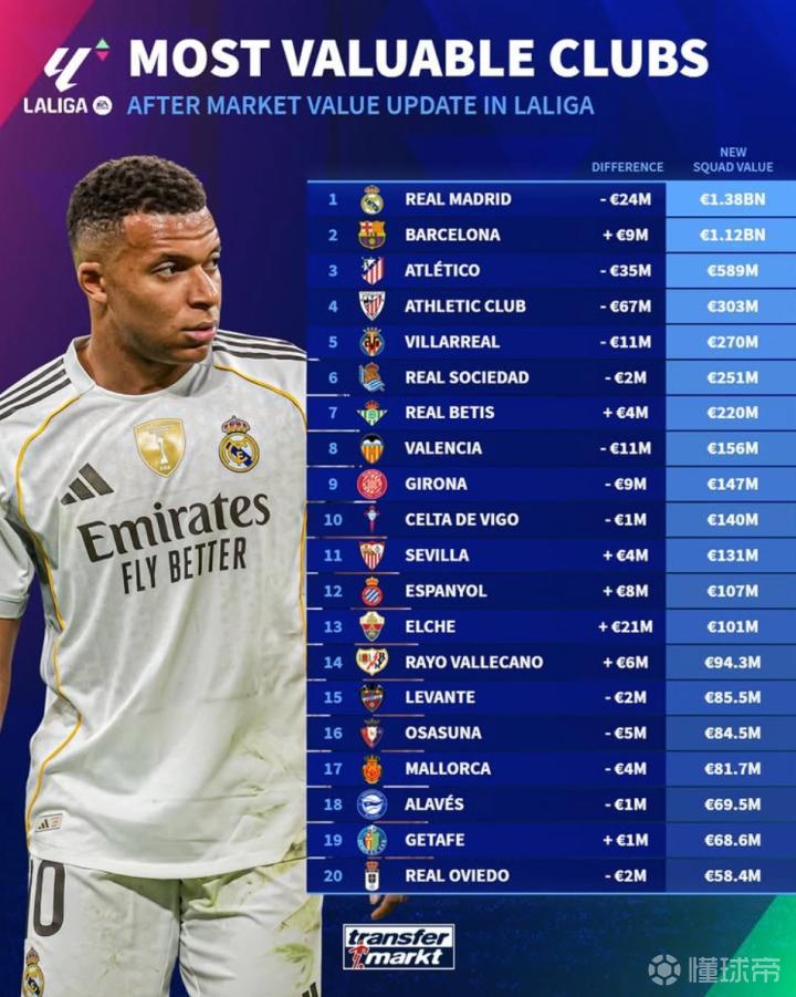 1. 皇家马德里 13.8亿欧元(-2400万欧元)