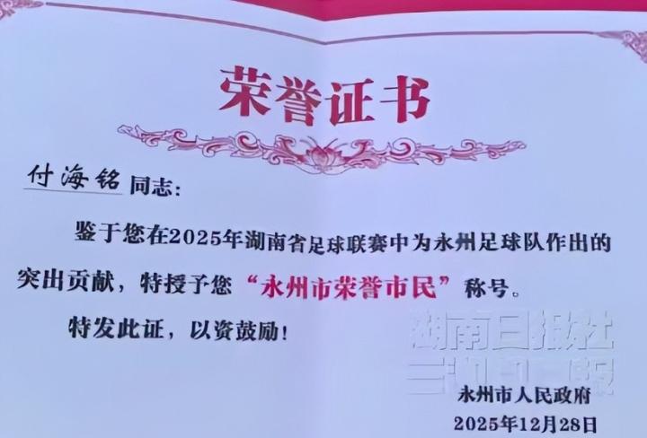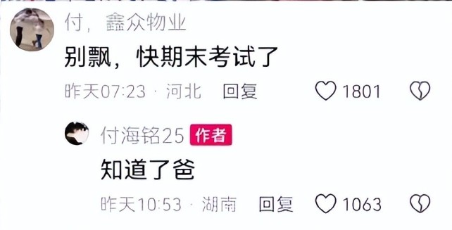 《扬子晚报》报道,永州队夺得2025“湘超”冠军后,永州队球员付海铭在社交媒体里晒出自己身穿冠军金衣、手拿金牌的照片。在评论区里,付海铭的父亲留言“提醒”:“别飘,快期末考试了。”