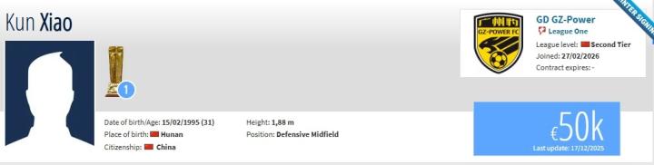 肖鲲现年31岁,司职中场,在2025赛季加盟青岛海牛,效力期间共出场16次,打进1球,赛季结束后离队。现在他在德转上的身价为5万欧元。
