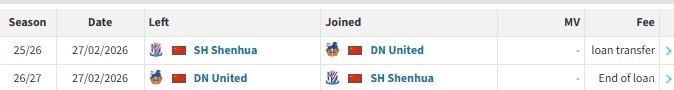 北京时间2月27日,德转更新,上海申花前锋王汉龙租借加盟定南赣联。