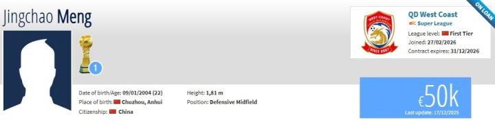 德转显示,孟敬朝从上海海港租借加盟青岛西海岸的租借费为6000欧元,约4.9万人民币。现在他的身价为5万欧元。