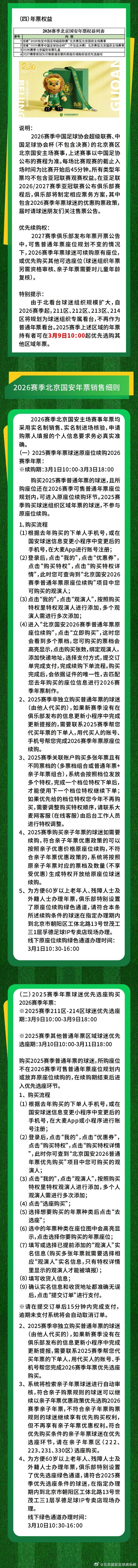 北京时间2月28日,北京国安官方公布了新赛季年票公告。