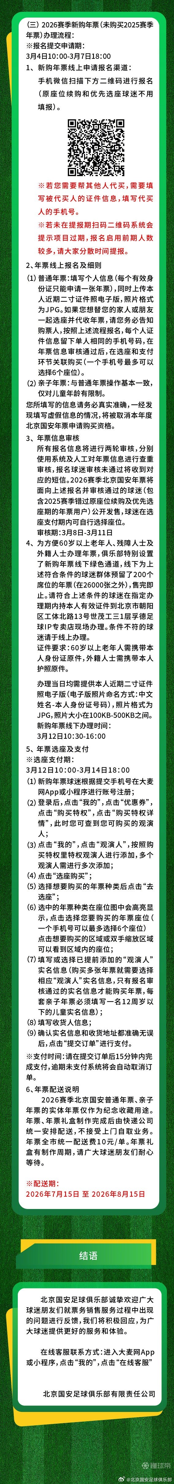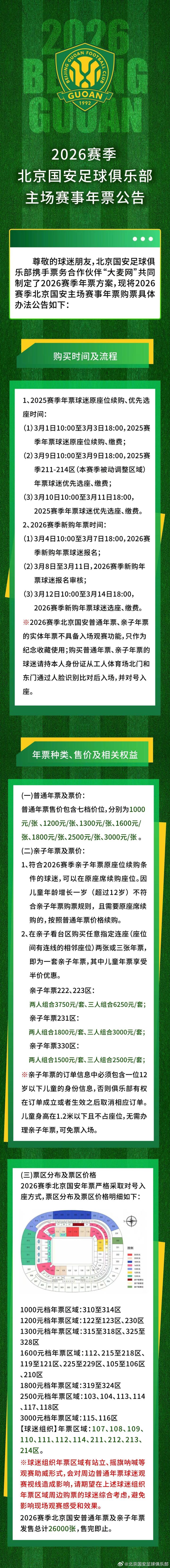 尊敬的球迷朋友,北京国安足球俱乐部携手票务合作伙伴“大麦网”共同制定了《2026赛季主场赛事年票方案》。