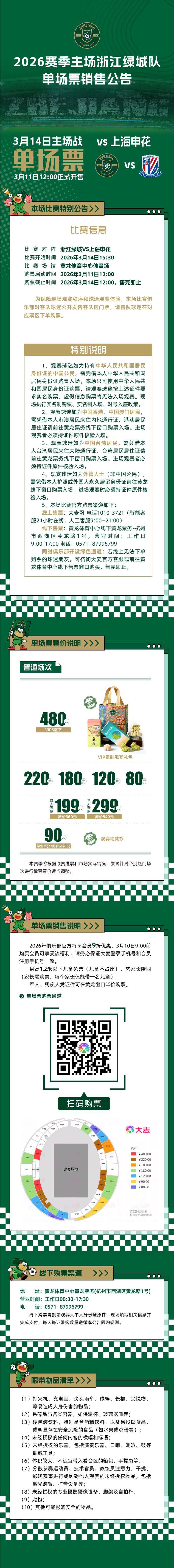 北京时间3月10日,浙江队发布公告,球队主场战上海申花的球票周三12:00开售。赛事定级为普通场次,价格80-480元。