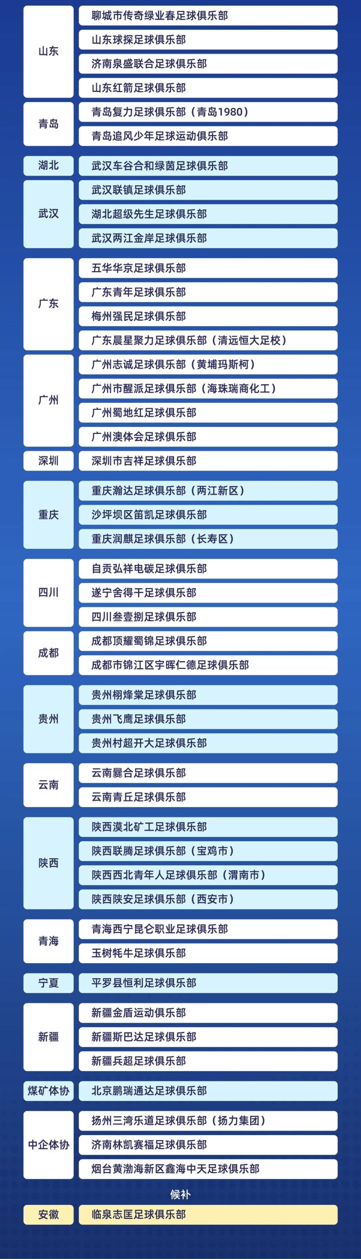 名单中有号称“新江苏队”的江苏常晋,也有恒大足校班底的广东晨星聚力,还有贵州村超的代表——贵州村超开大。安徽临泉志匡俱乐部成为候补俱乐部。