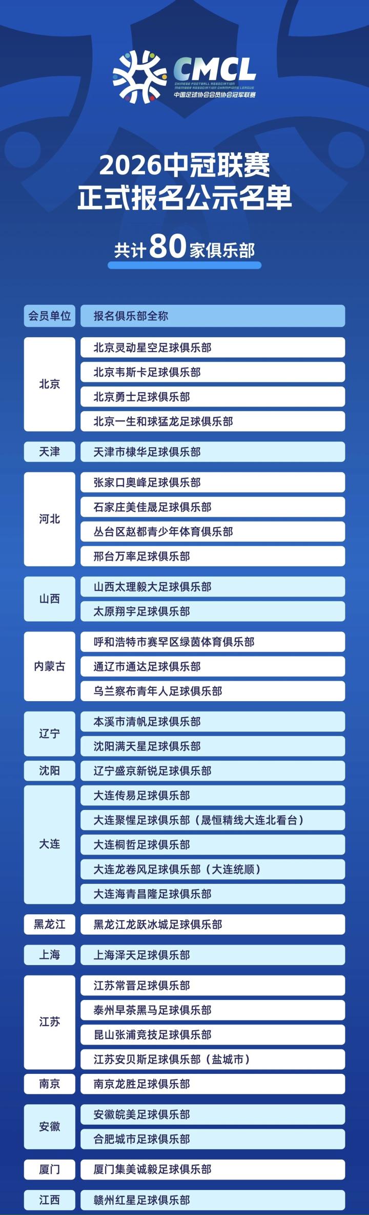 3月18日,中冠联赛官方公布了2026赛季报名参赛球队的公示信息,一共有80家俱乐部参加今年的中冠比赛。