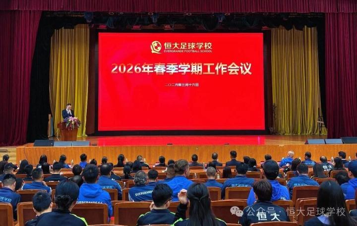 恒大足校官方消息,3月16日晚,恒大足校在学校大礼堂召开2026年春季学期工作会议。会议由刘立副校长主持,学校全体教职工参加。