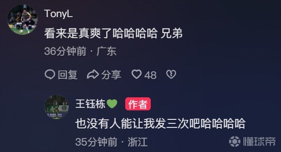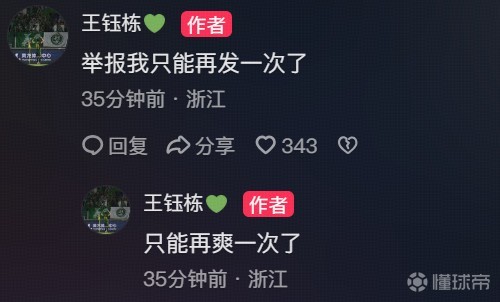 北京时间3月22日,浙江球员王钰栋在抖音再次晒出了对阵青岛海牛时进球的庆祝照,并配文“继续发继续爽”。这次王钰栋在照片中把海牛球迷做了打码处理。