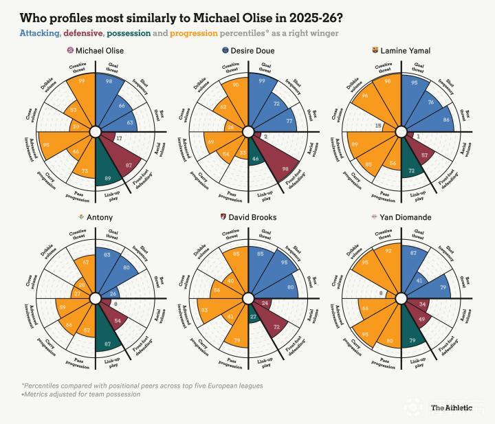 目前很少有左脚右边锋能达到更高的水准:在欧洲五大联赛中,没有人能比奥利塞的17次助攻更多。他拥有沉肩变向、在防守球员间穿梭以及在高速奔跑中完成致命一击的能力,让他成为足坛稀缺的“异类”球员。。