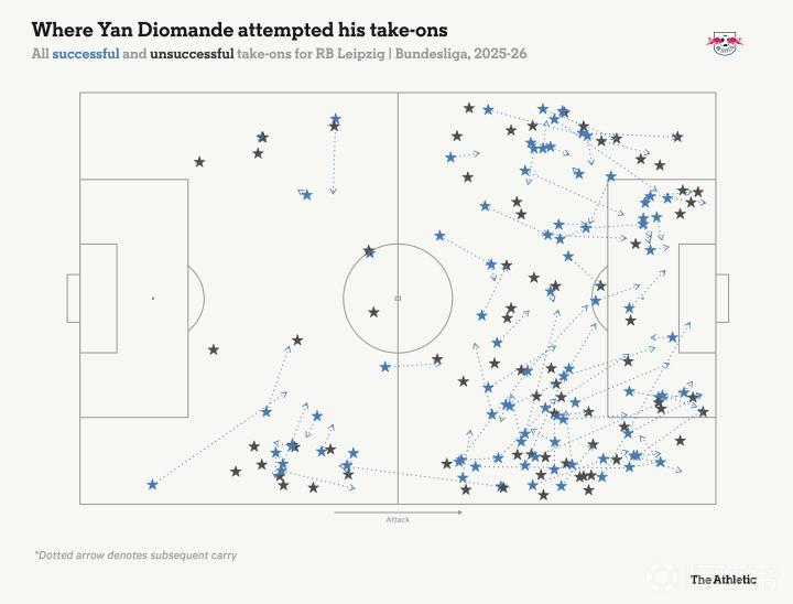这位科特迪瓦国脚去年夏天才从莱加内斯转会至RB莱比锡,但已引起广泛关注。如上图所示,迪奥曼德非常喜欢盘带……非常频繁。在欧洲顶级联赛所有球员中,只有维克托-穆尼奥斯(奥萨苏纳)、维尼修斯(皇家马德里)和亚马尔(巴塞罗那)的成功过人次数比他更多——如下图所示,他能在两条边路都完成突破。