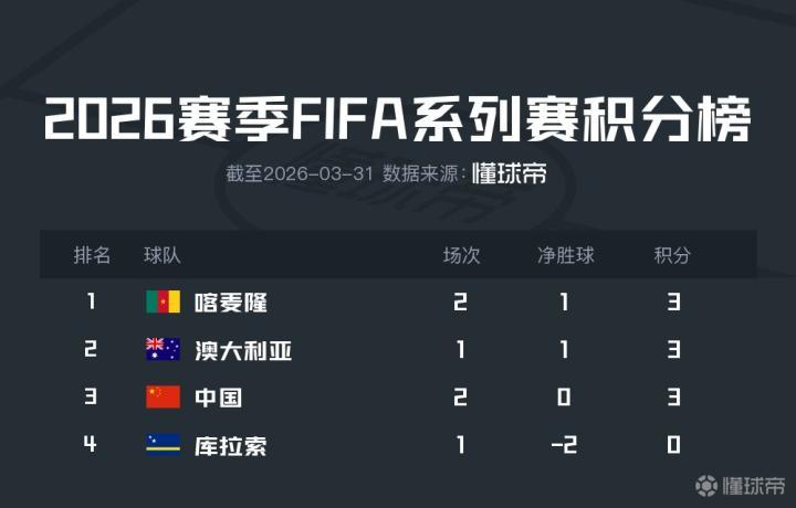 北京时间3月31日,FIFA系列赛中,国足0-2不敌喀麦隆,结束了本期国际比赛日窗口的全部比赛。目前国足排在澳大利亚赛区第三位,跟喀麦隆、澳大利亚同分,领先库拉索。