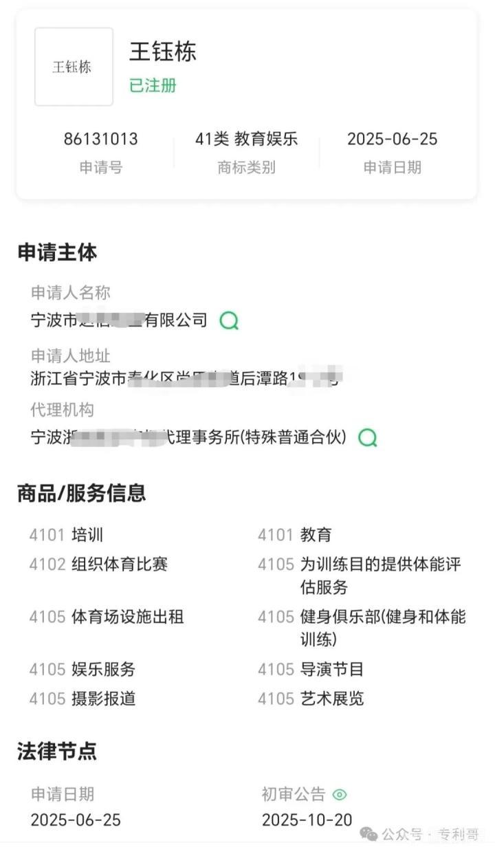 近日,博主“专利哥”发文,称经过查询,王钰栋的名字已经成功注册了50多个品类的商标,申请人则是宁波的一个厂家。