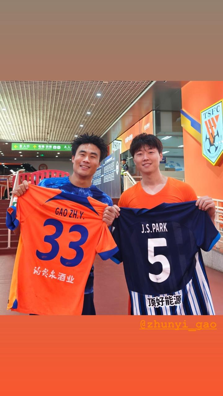 中超第26轮,山东泰山主场对阵武汉三镇,今日,武汉三镇后卫朴志洙在社交媒体晒出他和前队友高准翼互换球衣的合照。