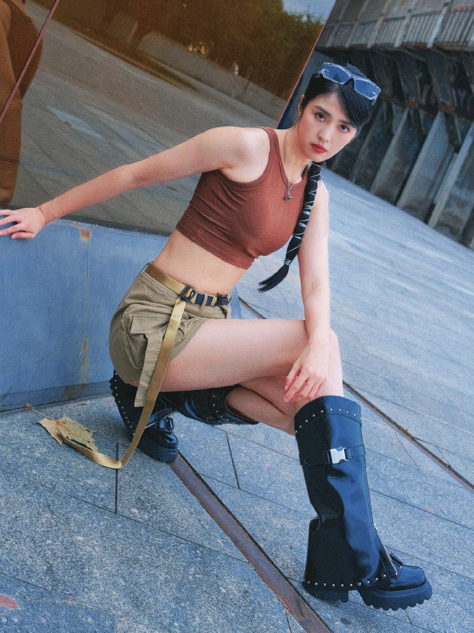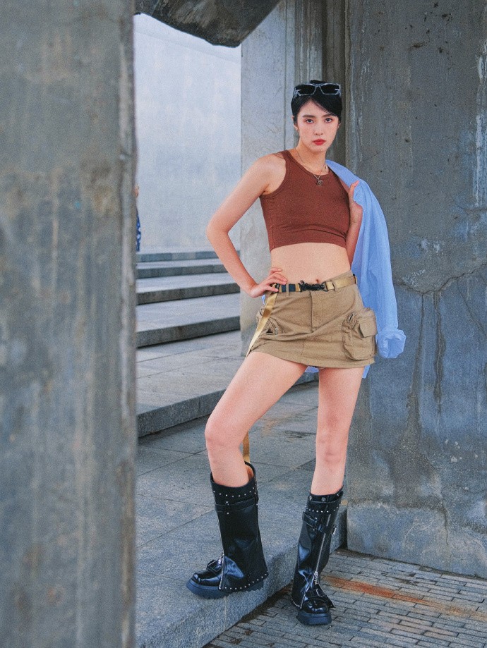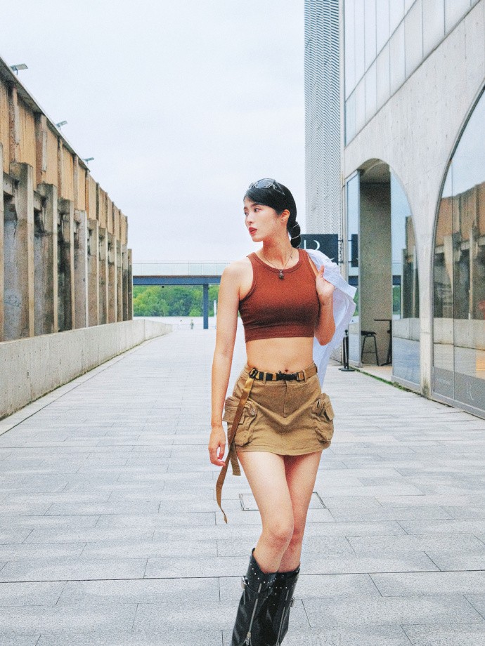 上身是橙红色的运动背心,下身则是西部牛仔风格的短裤,还有一双黑色皮靴。既显示出她的大长腿,也有细柳腰,更多的是展现出她敢于突破,敢于尝试的性格。