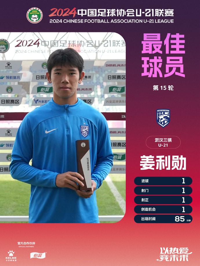 在U-21联赛决赛第四阶段第15轮比赛中,武汉三镇足姜利勋打入1球且全场表现出色,帮助球队1比1战平成都蓉城,他被评为该轮最佳球员。
