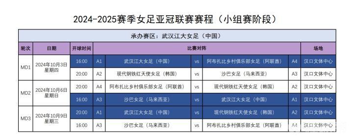 2024-2025赛季首届亚足联女足俱乐部冠军联赛(女足亚冠联赛)将于2024年9月开启,2023赛季中国足球协会女子足球超级联赛冠军武汉江大女足将代表中国参赛,目前赛程已经出炉。