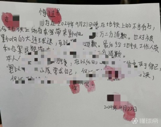该博主写道:“地铁泼水事件的广州球迷,已经被行政处罚罚款,并向大连球迷手写了悔过书和道歉信,希望此类事件今后不再发生,大家能够知法懂法,不要不以为然,不做法盲。 ”
