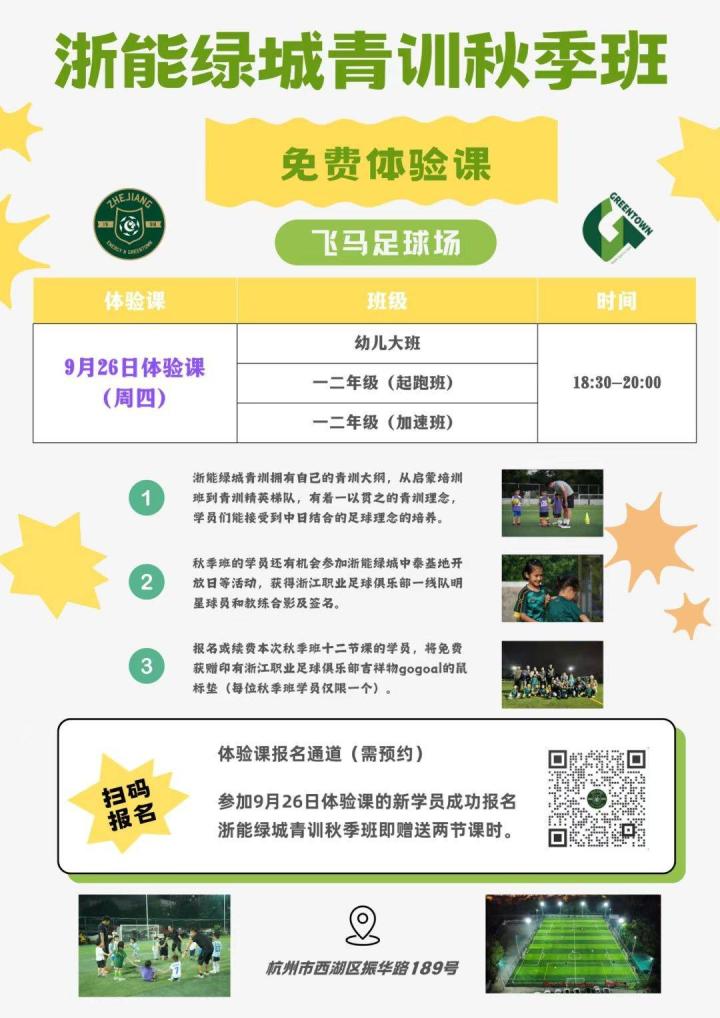 浙江队官方写道:“9月26日(周四)18:30-20:00,浙能绿城青训将在西湖区飞马足球场开设免费体验课,届时将会有日籍教练大山真人领衔的教练团队来到现场为孩子们带来专业有趣的足球教学,另外参加9月26日体验课的新学员成功报名秋季班即赠送两节课时,名额有限,记得扫码预约报名哦。”