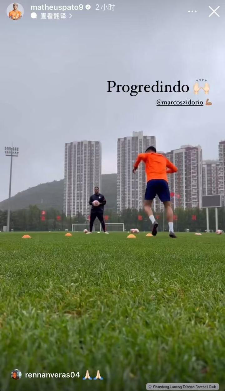 山东泰山外援马特乌斯-帕托在社交媒体发布视频,已经回到基地进行个人训练。
