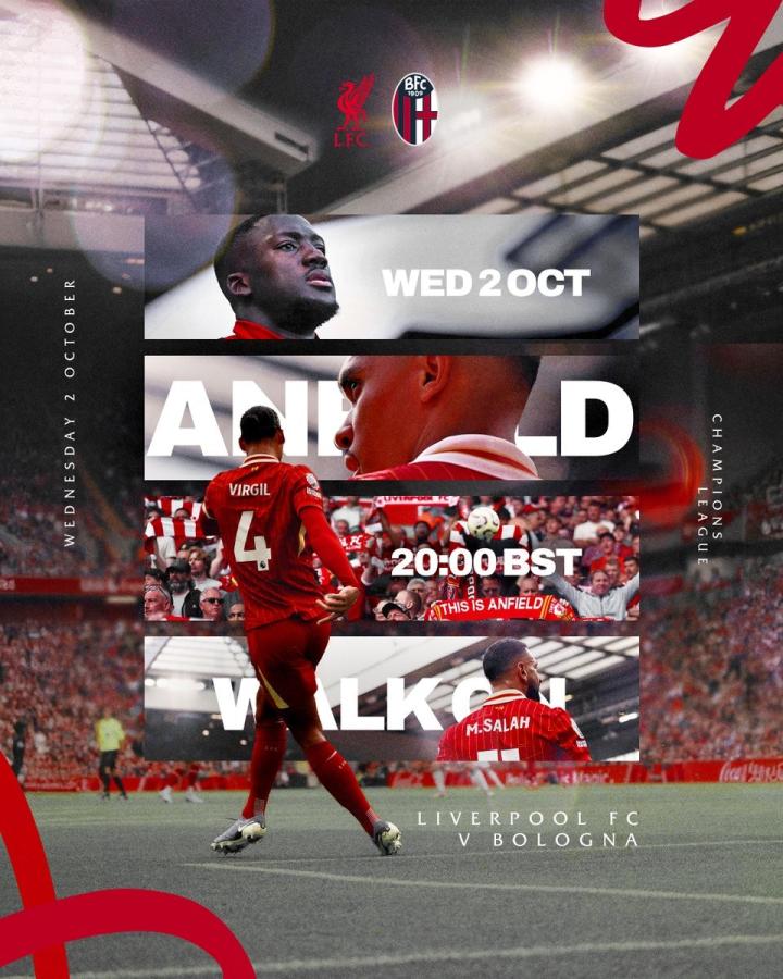 欧冠联赛阶段第2轮,利物浦将主场对阵博洛尼亚,赛前,利物浦官方发布比赛海报。