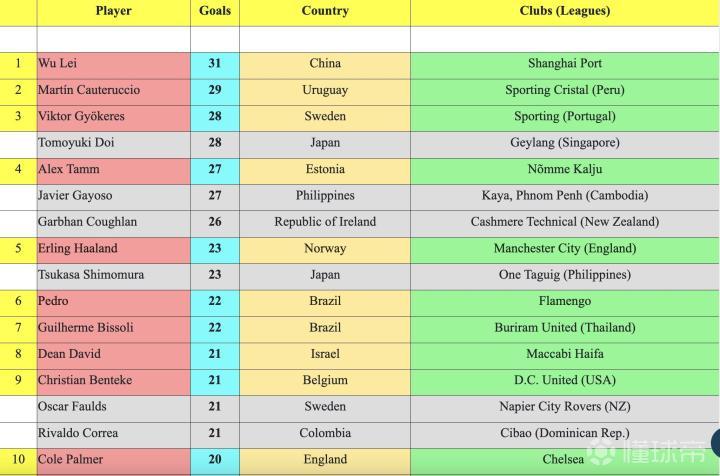 这份榜单里,武磊以本年度联赛31球排名第一,第二和第三名的射手来自秘鲁联赛和葡萄牙联赛/新加坡联赛。