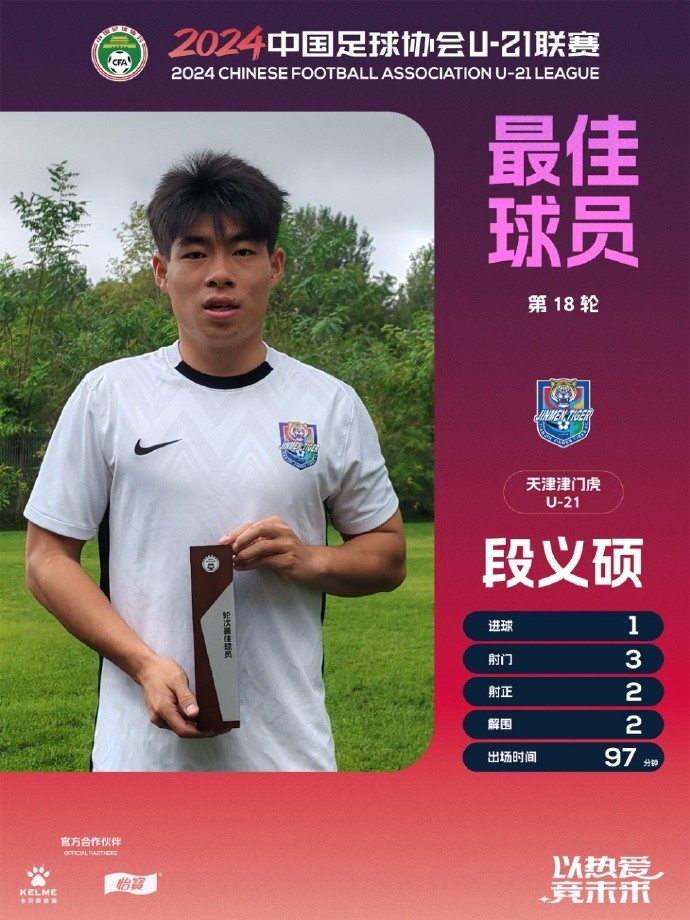 北京时间10月2日,U21联赛官方宣布,天津津门虎前锋段义硕当选决赛第四阶段第18轮最佳球员。