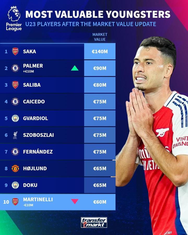 在更新了英超球员身价后,德国转会市场网站列出了英超U23球员身价排行榜前十,萨卡1.4亿欧居首,帕尔默9000万欧列第二。