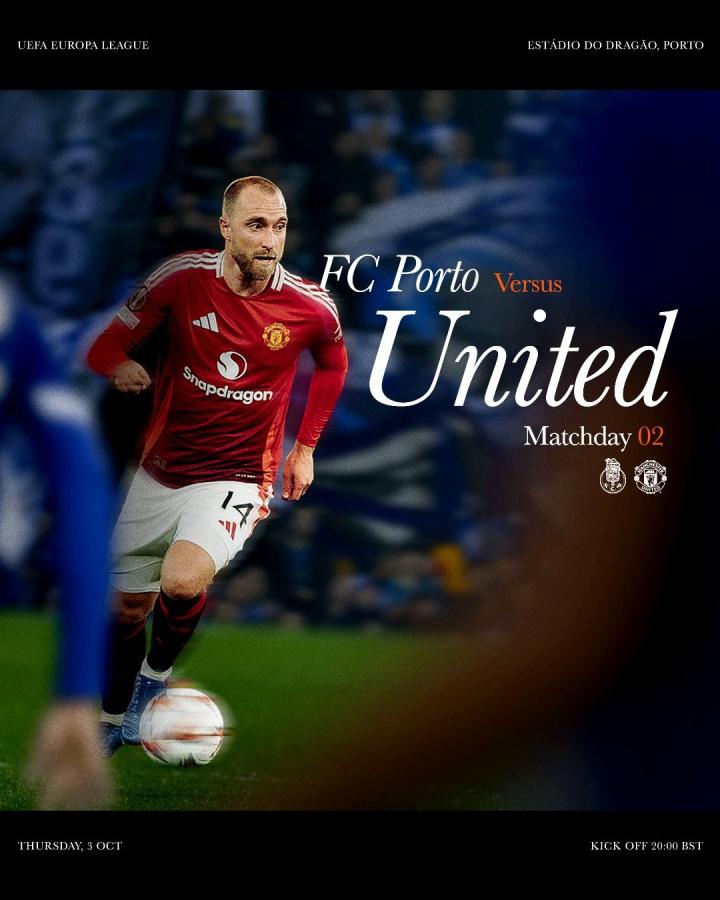 北京时间10月3日,曼联发布欧联杯联赛阶段第2轮,客战波尔图的赛前海报,中场埃里克森单人出镜。