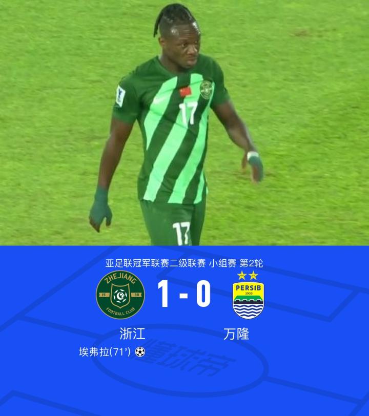 浙江1-0万隆取本赛季亚冠首胜,埃弗拉制胜球,程进失良机