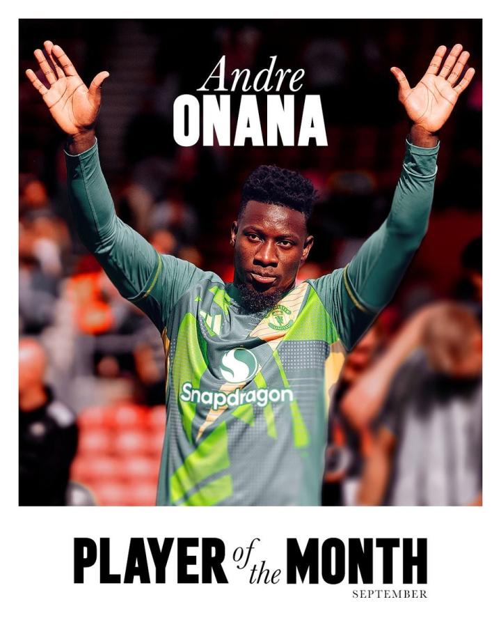 奥纳纳在这6场比赛中出场5次,收获2次零封。最终经过球迷评选,奥纳纳以47%的得票率当选曼联9月最佳球员。