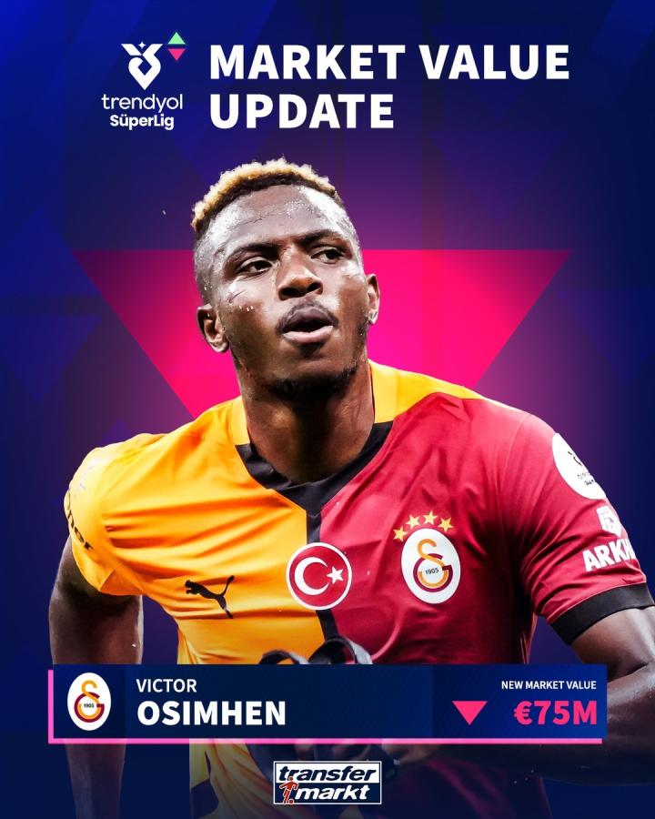 10月4日,德国转会市场网站更新了土超球员身价,今夏加盟加拉塔萨雷的奥斯梅恩暴跌2500万欧,从1亿欧降至7500万欧。