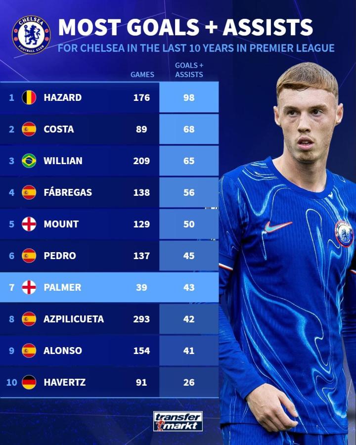 德国转会市场网站列出了近10年英超切尔西球员直接参与进球榜,阿扎尔98球居首,去年夏天加盟的帕尔默以43球位列第七。