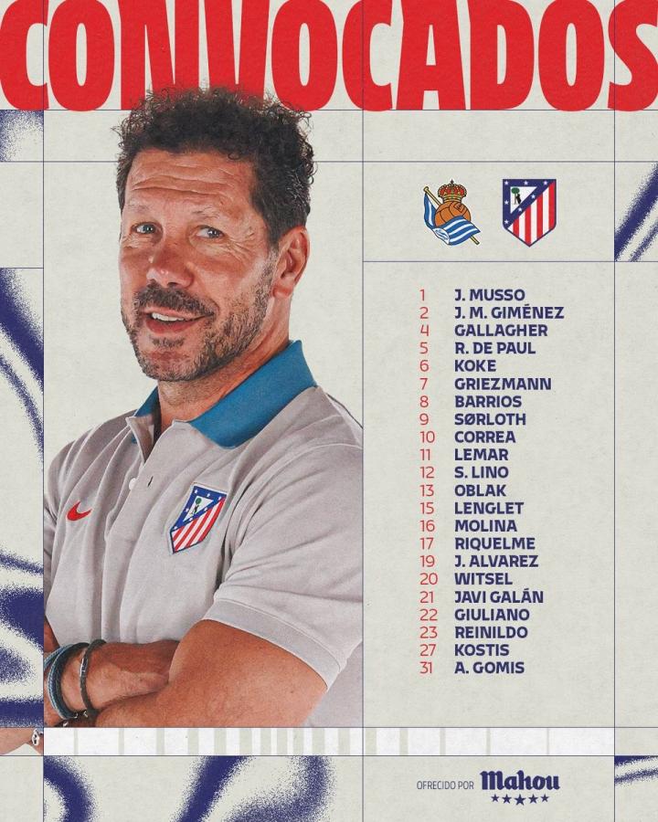马德里竞技官方公布了西甲第9轮客场对阵皇家社会的比赛大名单,格列兹曼领衔,巴里奥斯回归,勒诺尔芒伤缺,马科斯-略伦特停赛,比赛将于北京时间10月7日凌晨3:00进行。