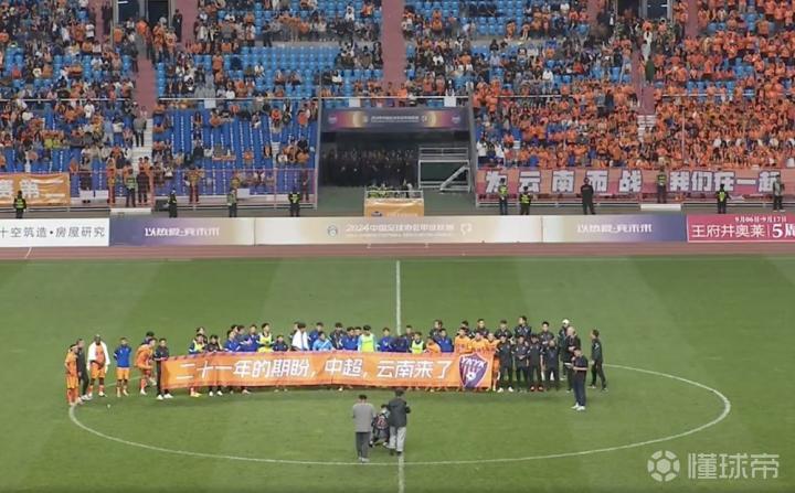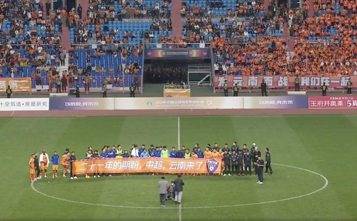 全队在现场打出横幅,上面写着“二十一年的期盼,中超,云南来了”。