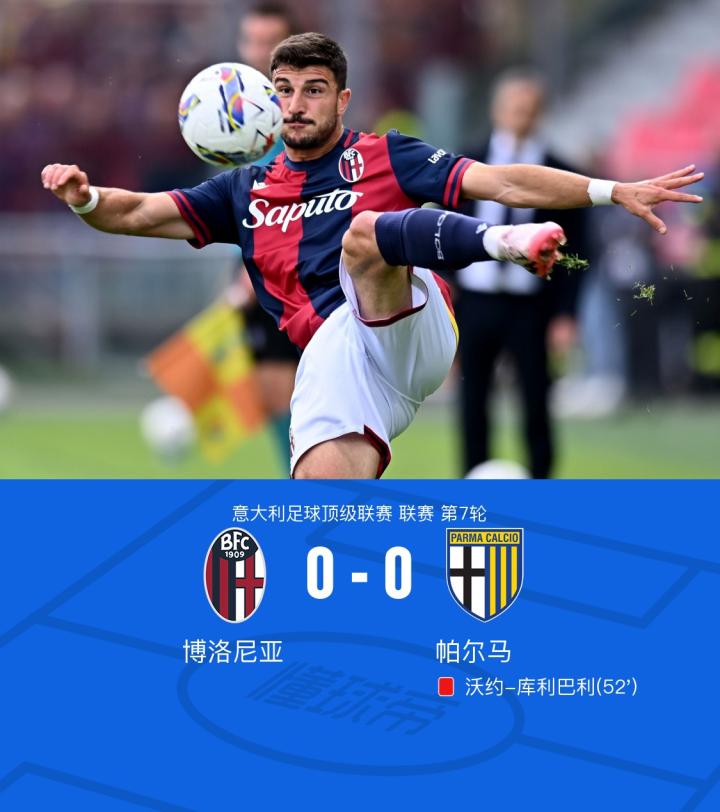 博洛尼亚0-0十人帕尔马,沃约-库利巴利染红,卡斯特罗造险
