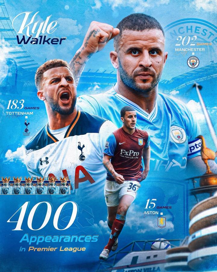 在达成英超生涯400场里程碑后,曼城队长凯尔-沃克在社交媒体晒出海报,并表达感谢。