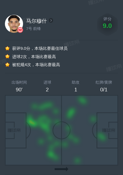 北京时间10月6日法兰克福vs拜仁慕尼黑,马尔穆什贡献2球,1助攻,1次关键传球,2次射门,3次成功过人。