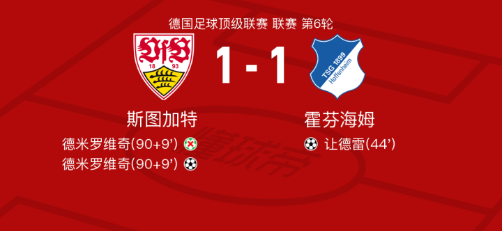 北京时间10月7日斯图加特vs霍芬海姆,奥利弗-鲍曼得到全场最高的8.4分,尤拉塞克得到全场最低的6.2分