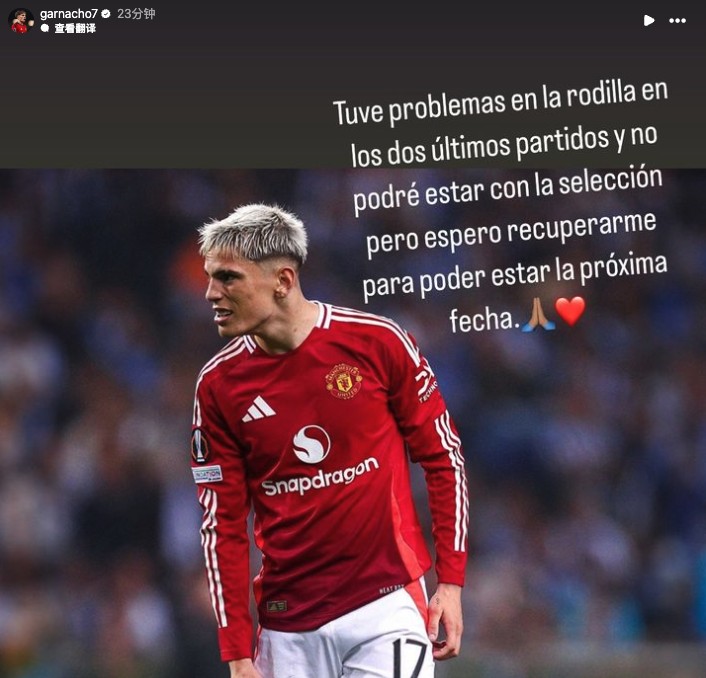 曼联的阿根廷前锋加纳乔在社交媒体上宣布,自己因膝盖问题无法参加10月份的国家队比赛。