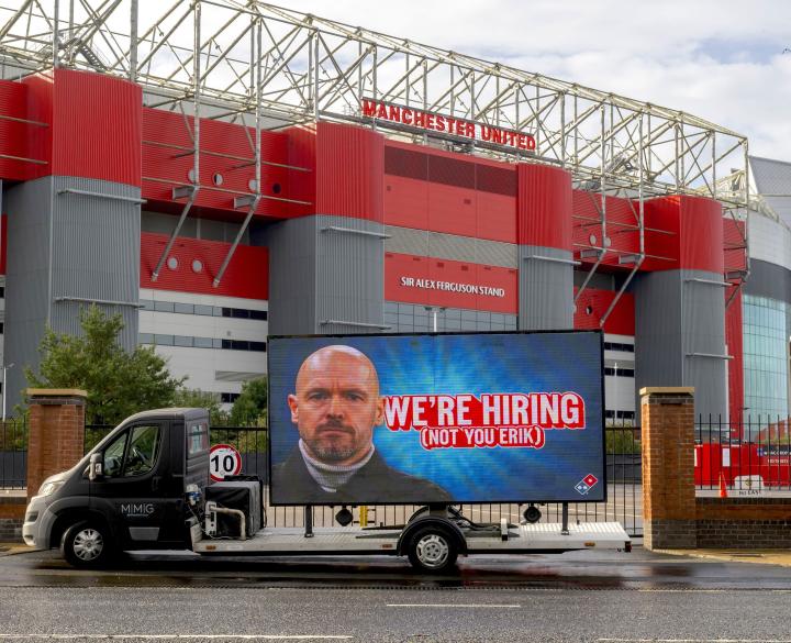 一直以擅长用体坛热点整活儿而著称的知名披萨连锁店达美乐也没有放过这个机会,他们特意在老特拉福德球场的大门外放了一块大屏幕播放广告,上面显示着“我们招新了,但不招你,埃里克”的字样以及巨大的滕哈格正面照。